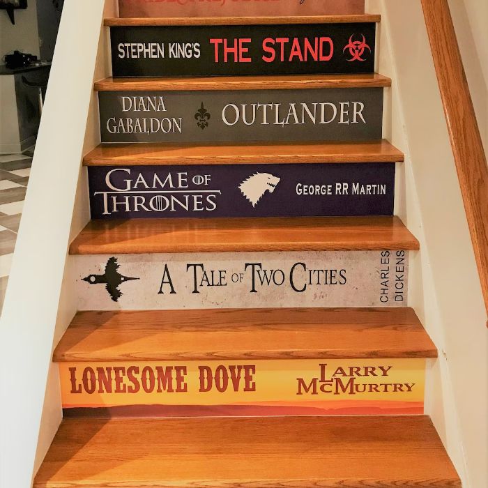 Custom Book Spine Stair Risers are a great way to create a unique space in your home. Each order is customized to your exact book choices and stair riser sizing.
