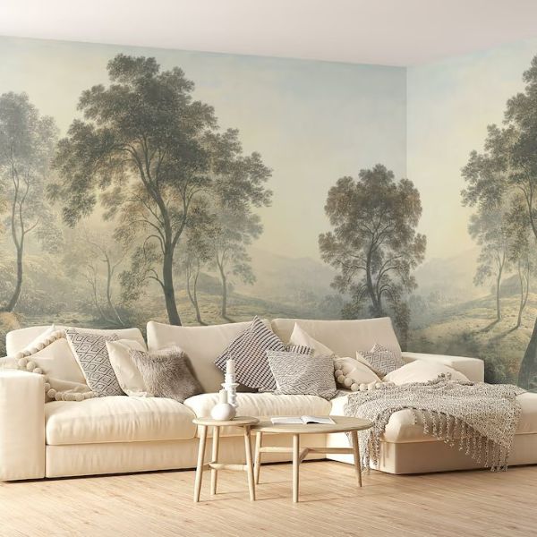 Sunny day in the hills Vintage landscape wallpaper Removable peel-and-stick Scenic painting mural, Village, trees Countryside decor wall art